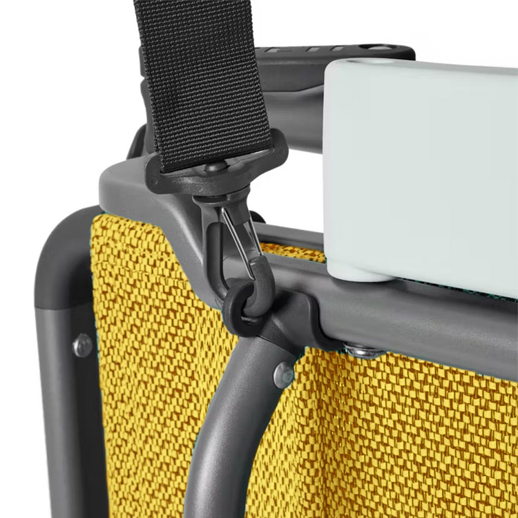 Sisältää kestävän, kevyen kantolaukun olkahihnalla helppoa kuljettamista varten. Taitettuna tuoli säilyttää ohuen profiilin, joka sopii täydellisesti auton tavaratilaan ja säilytyslokeroihin.