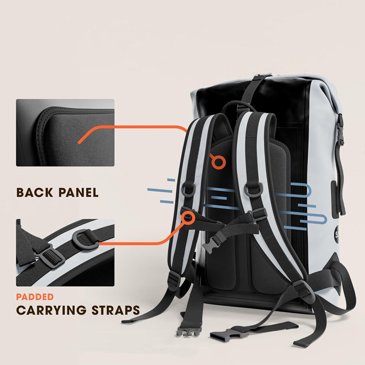 Sisältää mukavan pehmustetun olkahihnan, useat kantokahvat ja ulkoiset puristushihnat turvalliseen kiinnitykseen reppuihin tai vesikulkuneuvoihin aktiivisen liikkeen aikana.