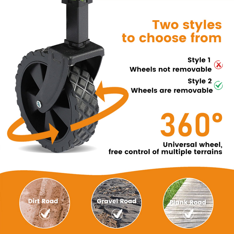 Varustettu 8 tuuman pneumaattisilla renkailla, joissa on syvät kulutuspinnat, jotka liikkuvat sujuvasti hiekalla, soralla, ruoholla ja epätasaisilla poluilla varmistaen samalla vakaan liikkeen ja helpon ohjattavuuden.