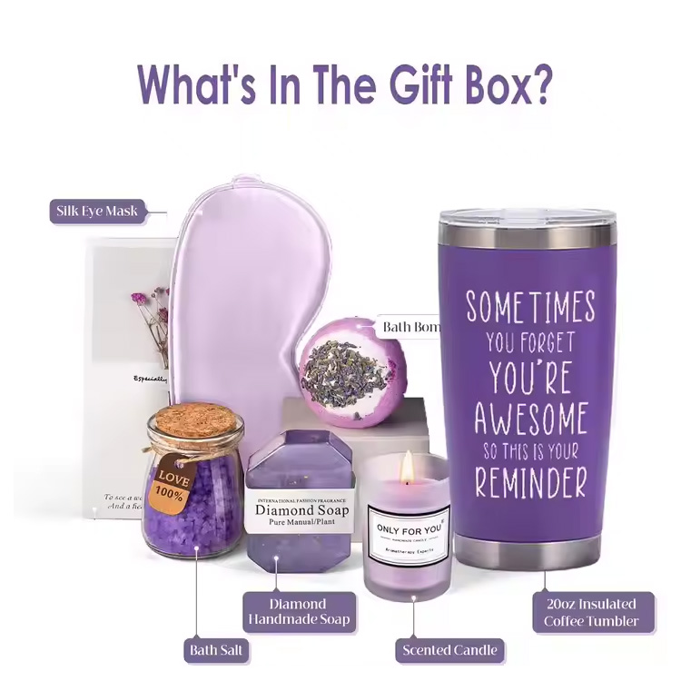 Jokainen Lunaire-lahjapakkaus sisältää kauniisti yhteensovitetun valikoiman esineitä, kuten ruostumattomasta teräksestä valmistetun juomapullon, aromaterapiakynttilä, timantin muotoinen saippua, kuivattuja kukkia ja onnittelukortteja. Tämä lahjaksi valmis setti säästää aikaasi ja tarjoaa täydellisen, sydämellisen kokemuksen kaikkiin tilaisuuksiin.