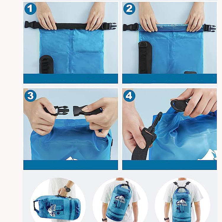 Roll Top Kannettava Helppokäyttöinen Kannettava läpinäkyvä kuivapussi.Innovatiivinen vedenpitävä ratkaisusi ulkoilmaseikkailuihin. Tässä uuden muotoilun kuivapussissa on läpinäkyvä rullasuljin, joka helpottaa tunnistamista. Useiden kokovaihtoehtojen ja kannettavan kantorakenteen ansiosta se on täydellinen patikointiin ja erilaisiin kosteisiin ympäristöihin.