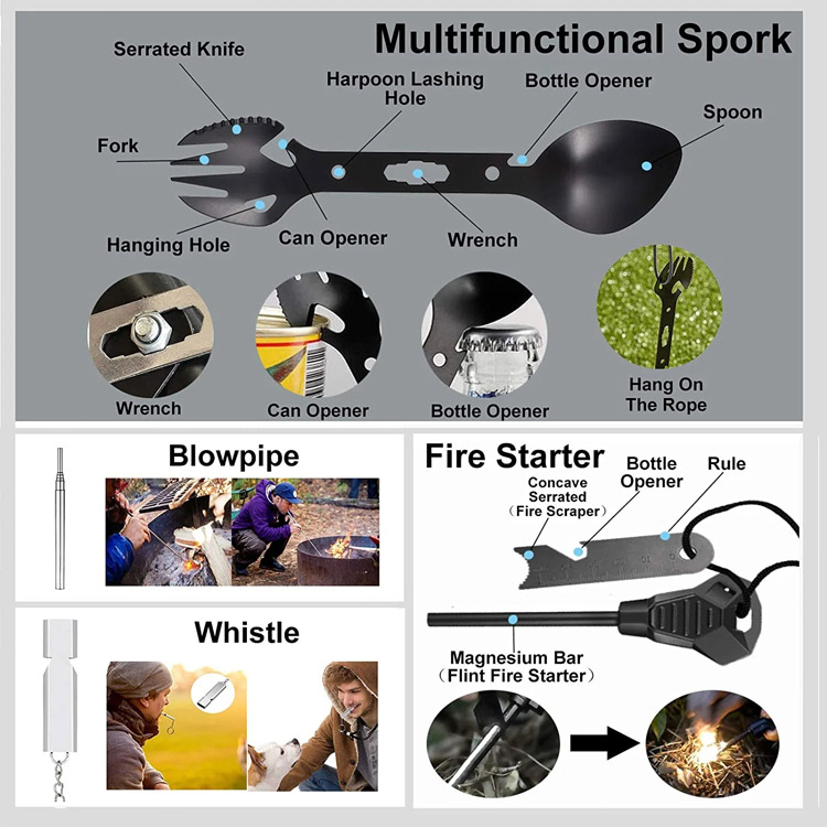 Sisältää magnesiumsytytystangon, jossa on tarkkuussytytin, joka tuottaa kuumien kipinöiden suihkun, joka pystyy sytyttämään tinderin myös kosteissa olosuhteissa, mikä varmistaa, että voit luoda elämää ylläpitävän tulipalon.